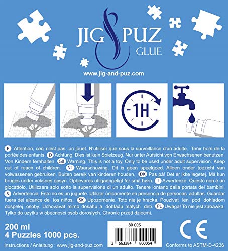 Colla per puzzle adatta per incollare 4 puzzle da 1000 pezzi. La Jig & Puz è una colla speciale per fissare i puzzle di medie e grandi dimensioni. Il tubetto di 200 ml è pronto all’uso e basta per fissare puzzle fino a 4000 pezzi, in un’ora asciuga completamente e diventa assolutamente trasparente. E’ adatto per tutti i puzzle classici.