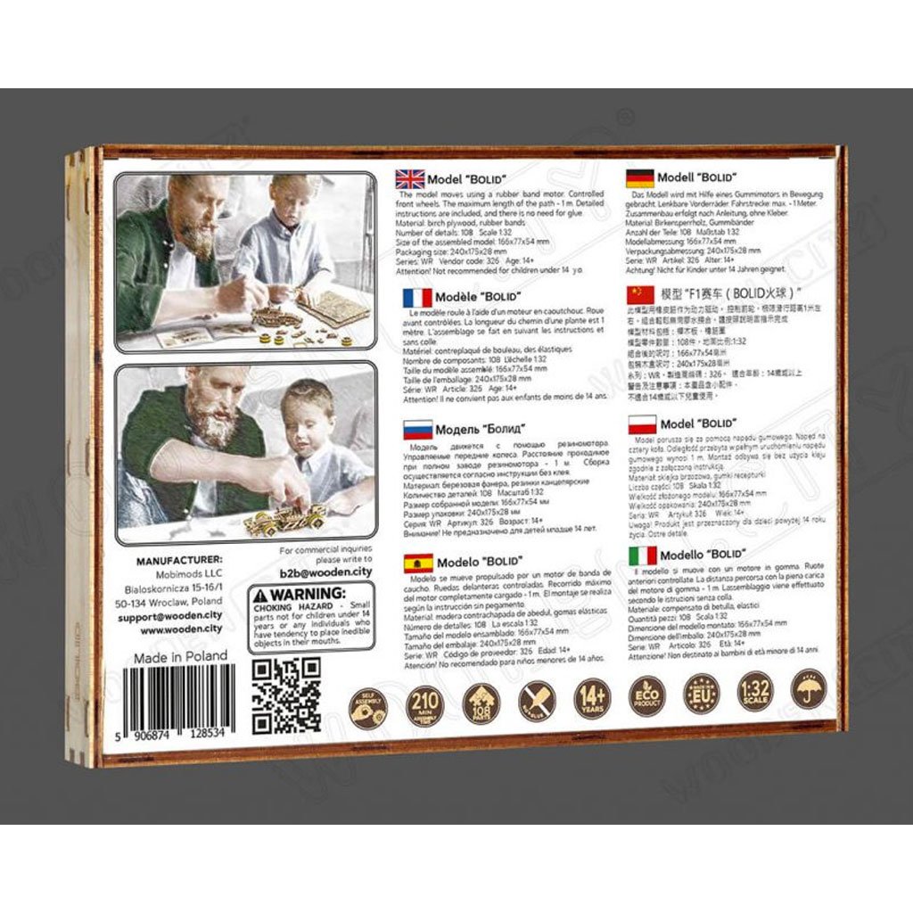 La Bolid in legno è un fantastico modellino di puzzle 3D che si muove realmente. Infatti, si tratta di un puzzle meccanico che grazie a degli ingranaggi in gomma e alle ruote sterzanti, crea un reale movimento.