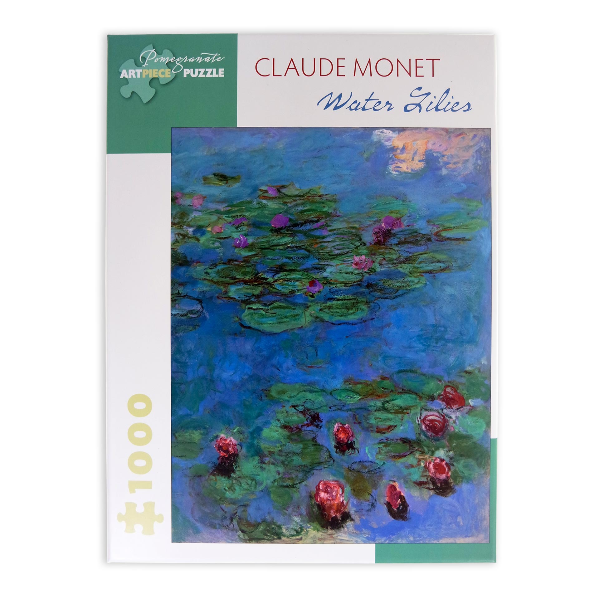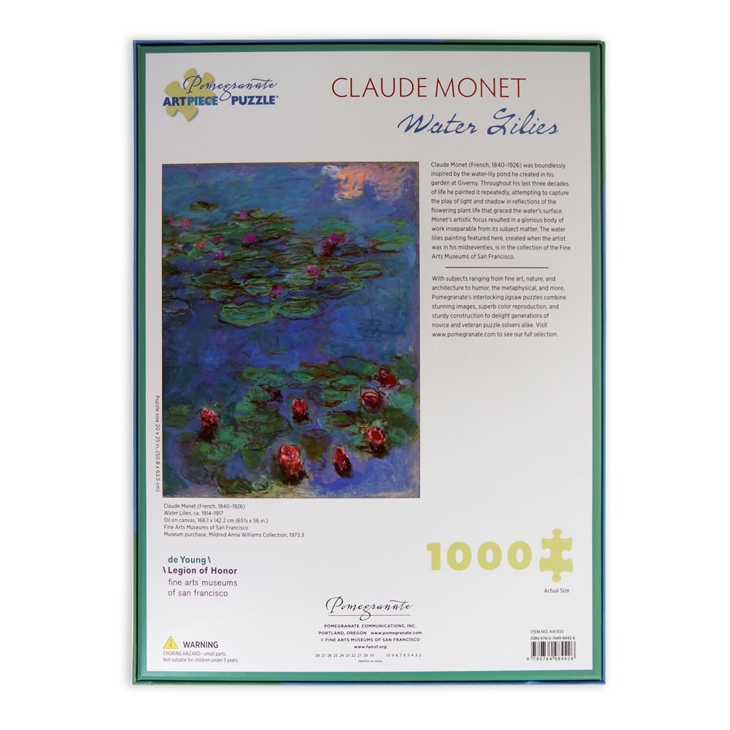 Il puzzle Monet Water lilies della marca Pomegranate da 1000 pezzi ritrae uno dei soggetti più belli e ricercati della serie delle ninfee del pittore Claude Monet. I giochi di luce, i colori brillanti, l’intensità delle pennellate fanno di questo puzzle d’arte un vero capolavoro da terminare e da appendere nella propria casa: un vero quadro d’arte.