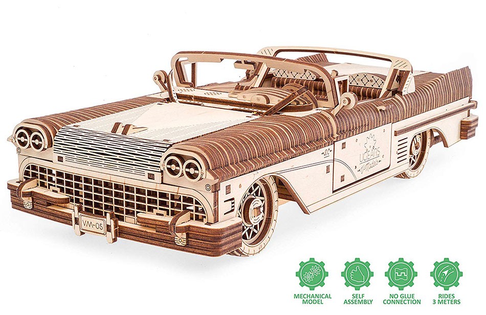 DESIGN E MECCANISMO COMPLESSO: Il modello VM-01 oltre ad essere realizzato con compensato di qualità superiore, un legno resistente ma flessibile che supera la prova del tempo, il roadster è realmente funzionante grazie alla trasmissione integrata e al motore con elastico e alla sospensione sulla ruota anteriore. -