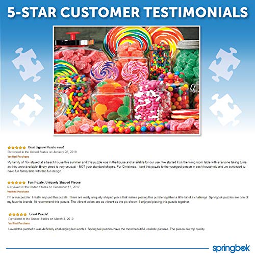 Candy galore. . . Cos’ altro si può dire? Un’ immagine mozzafiato non importa cosa la vostra età. Un best seller 2006 inverno/primavera puzzle. copyright gaetano images, Inc. springbok puzzle è stato un nome leader nel mondo dal 1963. Siamo concentrati sulla qualità che danno springbok la sua reputazione: originalità, innovazione e qualità superiore. Come uno dei pochi produttori di puzzle Puzzle che fa esclusivamente negli Stati Uniti d’ America, siamo orgogliosi della qualità dei nostri puzzle. La qualità dei nostri stampi e sopra media spessore della nostra chipboards assicura che le parti di collegamento si riuniscono attorno più volte. Come uno dei pochi produttori di puzzle di possedere brevettato puzzle muore, i nostri prodotti sono sempre originali. che si tratti di nostra famiglia 400 piece puzzle, o uno dei nostri stupendi paesaggi, non ci sono due puzzle, o pezzi, sono simili. producono solo 25 nuovi puzzle un anno è uno dei modi ti garantiamo che i nostri nuovi enigmi non all’ altezza degli standard di springbok. Materiali: bordo riciclata e inchiostro a base di soia bio lithography 1000 Piece Jigsaw Puzzle, con una dimensione finita di: 61 x 76,2 cm Made in the USA since 1963. Springbok Puzzle sono fabbricati con inchiostri a base di soia biologica sostenibile e utilizzare materiali 100% riciclati Ogni Springbok Puzzle Features 100% unique puzzle pezzi che si ripetono mai Prodotto con materiali riciclati e materie prime fonti sostenibili Soddisfazione Garantita al 100% coperto da oltre 50 anni come America’ s oldest Jigsaw Puzzle Company [amz_corss_sell asin=”B003CYKY8Y”]