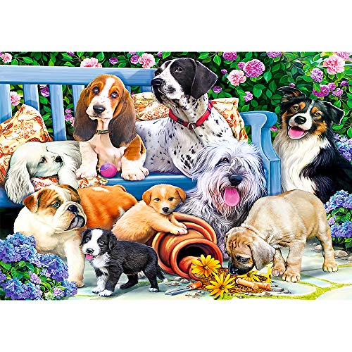 Il puzzle mostra una grande raccolta di diversi cani in giardino
